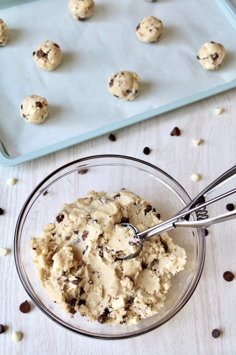 I find it easier to portion out the cookies on a parchment lined cookie sheet before placing them in the fridge, but you can also portion the dough out after it has been chilled. The cookies will not spread out too much, so you only need to leave 1 inch of space between each cookie.